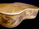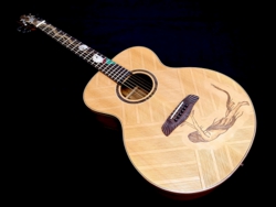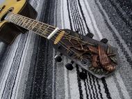 指板には、4羽の小鳥のインレイ、ヘッドには卵を抱いた親鳥の彫刻。ボディ全体にも木彫りによる模様が彫りこまれた美しいモデルです。