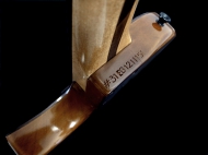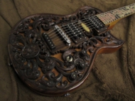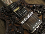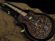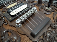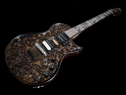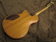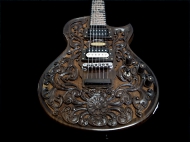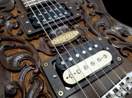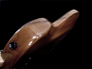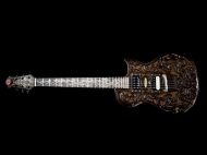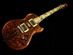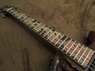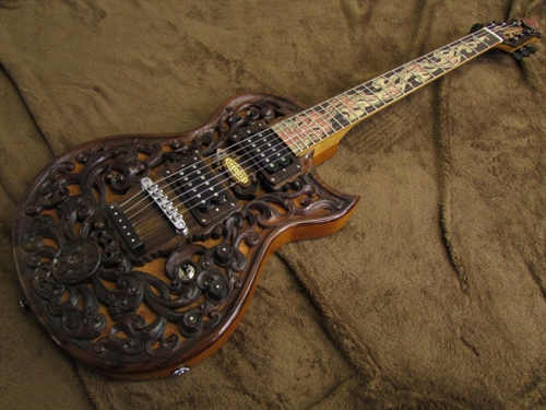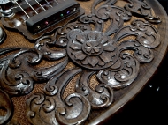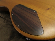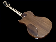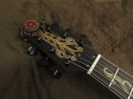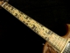 ゴージャスでありながら、ぎらぎらした装飾とは違う自然な美しさ、その存在感は絶大ですが、バックの下部まで入ったコンツァー加工や、ストラップピンの位置など、その弾き易さやスタイルは実にプレイヤー本位の弾く為の1本です。