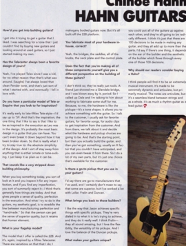 When my editor asked me to review a Tele that I had stumbled upon at Summer NAMM – I jumped at it for added insurance of residency. In honor of Quentin Tarantino, I won’t build up any suspense, go on about technical details or geek-speak before giving you the final work, so here goes -- I loved it! It’s everything a Tele should be. The Hahn contains many elements that are sadly missing from many instruments made by top luthiers today.