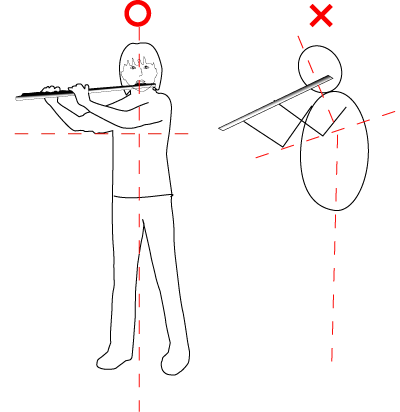 | ●基本姿勢 1.立って練習しましょう。 姿勢は背筋を伸ばしてまっすぐ前を見ましょう。 2.フルートに口を近づけるのではなく、フルートを口に近づける様に構えましょう。 3.構えた時、唇とフルートを平行にしましょう。 4.立った姿勢は、足を肩幅くらいに開いて、譜面台に対して右足を後ろに引いて斜めに構えてください。※右図 5.右手を前に出し、顔、フルートと譜面台が平行になるように構えましょう。※右図 6.楽に息を吸うようにしましょう。(口と鼻の両方を使って息を吸い込むようにしましょう) 7.肩に力をいれず、上半身はリラックス、重心を下半身に持たします。下腹に力をいれしっかりと立ってください。 8.下図○は良い姿勢の参考にしてください。 ×はヒジが下がりすぎて肺を圧迫し、無理な呼吸になってしまいます。 |