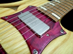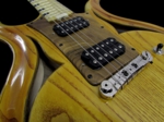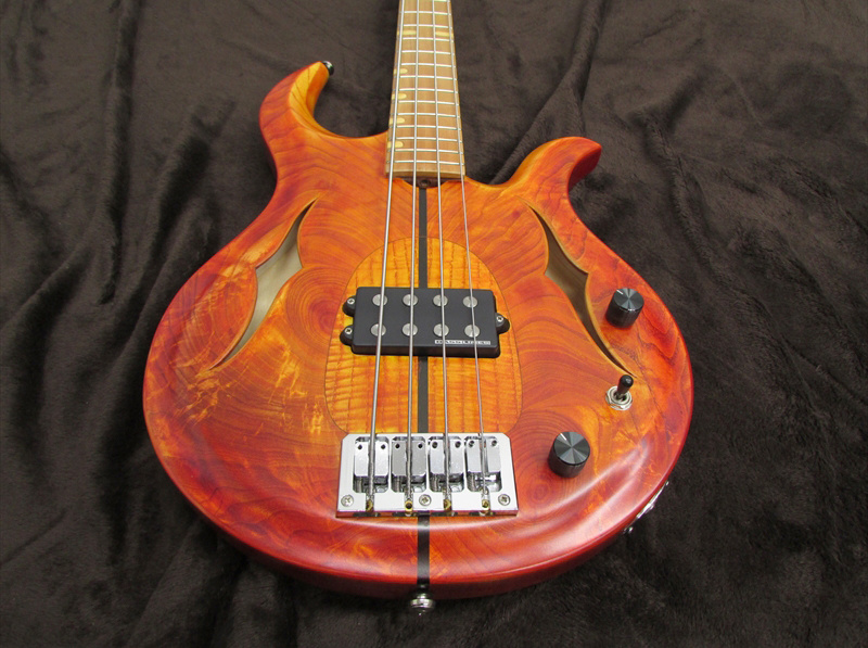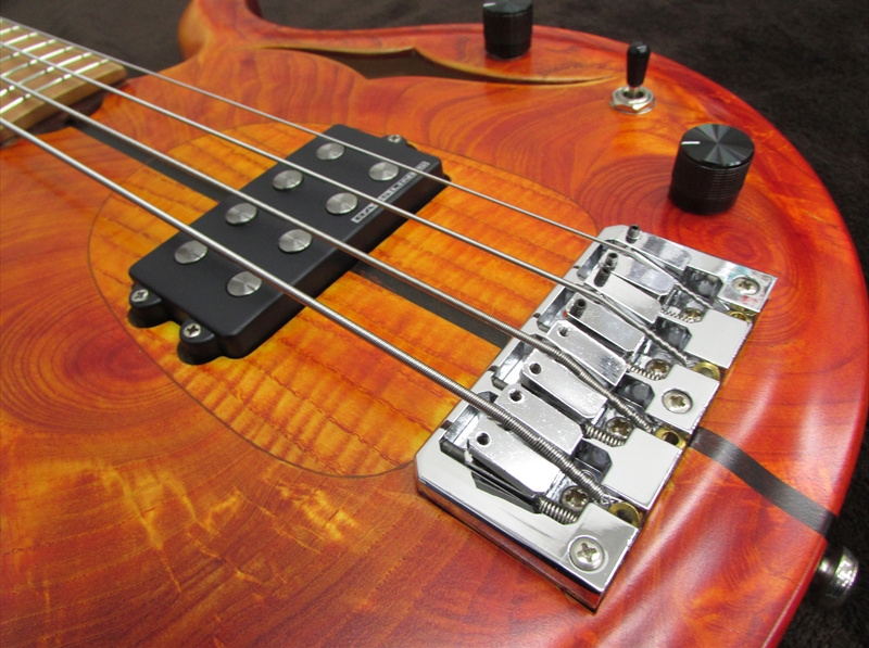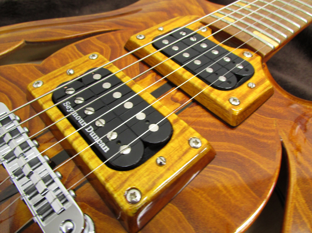 今回入荷したベースモデルは、ホロウボディモデル。メイプルコアと斬新な木目のアッシュボディトップ&バックという仕様で、ピックアップにはSeymour Duncan SMB-4Dを一基搭載し、トグルスイッチにより、リア側シングル/パラレルミックス/フロント側シングルの切り替えが可能で、通常のハムバッキングとは違うパワー感と透明感を持ったサウンドとなっています。