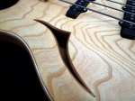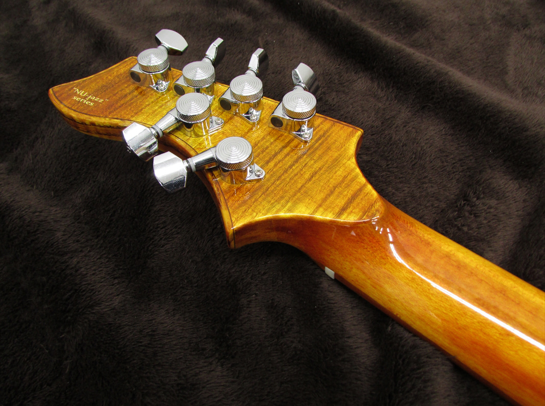ボディはメイプルコアにアッシュをトップ&サイド&バックで挟み込んだような仕様となっており、ネックにはメイプル/スウィートチェリー/メイプルの少し太めの3P/Cシェイプ・ネックに、Rowan(ヨーロッパナナカマド)の美しい木肌のスムースな指板を採用。24Fで深く入ったカッタウェイは、ハイポジションへのアクセスも容易です。基本的なサウンドは、ホロウボディの空気感を含みながらも、太い中高域が特徴的なレンジ感のあるサウンドで、ニュージャズのモデル名のように、様々な音楽スタイル、ロックにまで適応するモデルに仕上がっています。