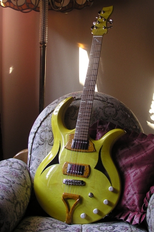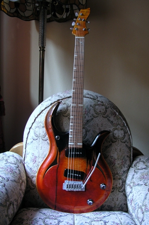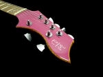 両サイドにホールを持つ、セミホロータイプのボディが特徴的なモデル。太目のソフトVネックのロングスケールですが、その独特のシェイプが持つ、バランスの良さ、ハイフレットまでのアクセスの良さなど、非常に考え抜かれたモデルとなっています。