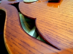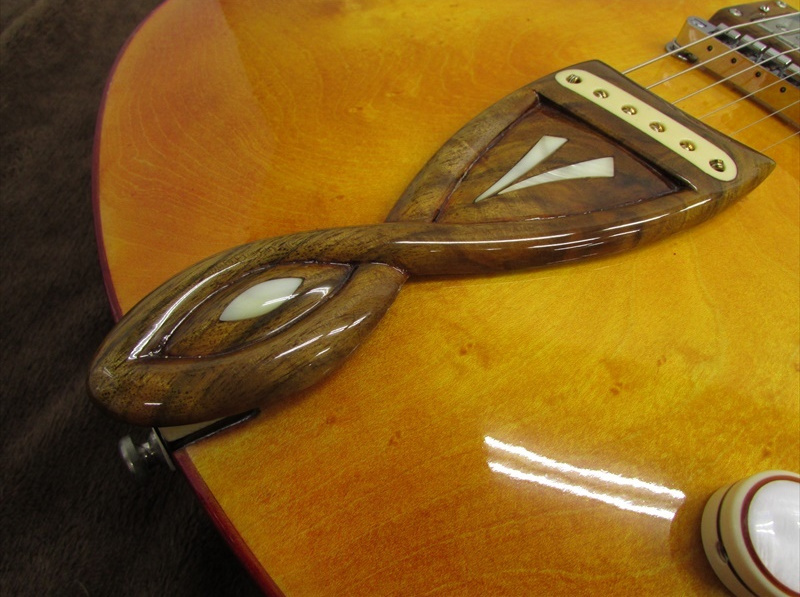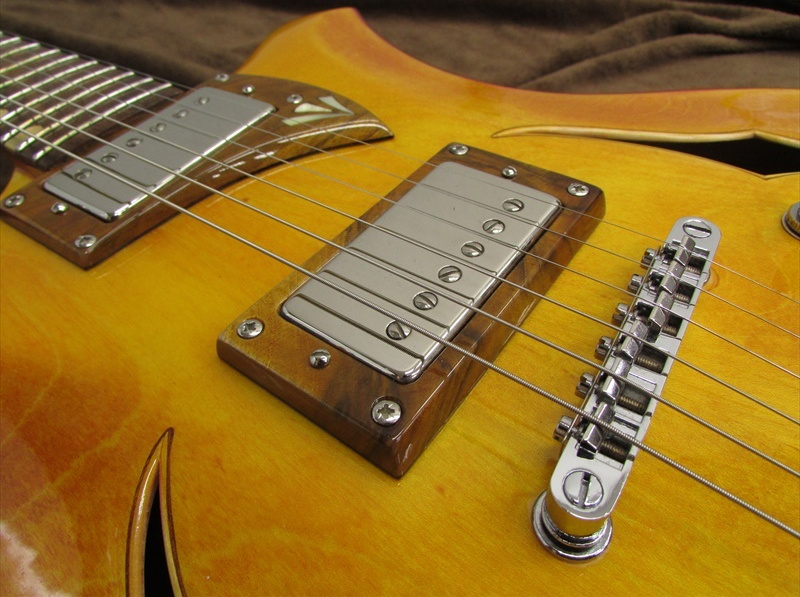 Jazz Vanpier(ジャズ・ヴァンパイア)となずけられたこのモデルは、厚み約45mmの15.5インチボディのフルアコースティックモデル!!複雑に組み合わされたボディは、生鳴りもよくアコースティックなサウンド。フルアコ/ジャズ系では、あまり見受けられないアッシュトップ&ウォルナットバックですが、そのサウンドはふくよかなジャズトーン。
