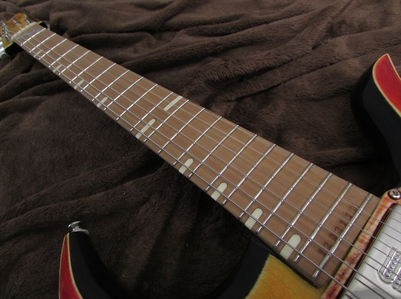 ミニハムバッカーですが、非常に美しい鈴鳴り感があり、低音は程よくタイトで立ち上がりがよく、しかし、ふくよかさは十分あり抜けの良いサウンドです。ロングスケールですが、テンション感も程よく、立ち上がりの早いギターにありがちな硬さがありませんので、チョーキングやビブラートなどのテクニックもニュアンスが出しやすい実用本位のモデルです。