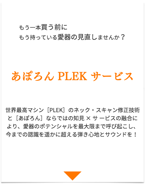 世界最高マシン[PLEK]のネック・スキャン修正技術と[あぽろん]ならではの知見 x サ ービスの融合により、愛器のポテンシャルを最大限まで呼び起こし、今までの認識を遥かに超える弾き心地とサウンドを!