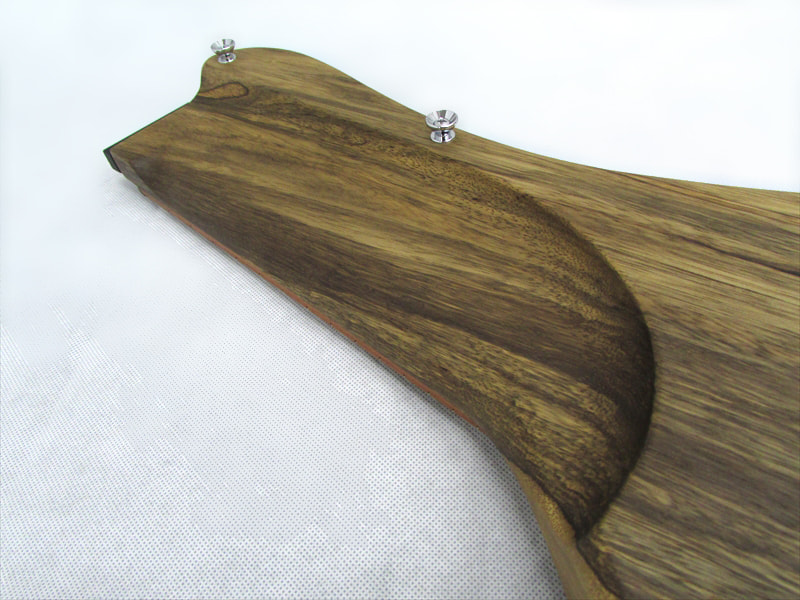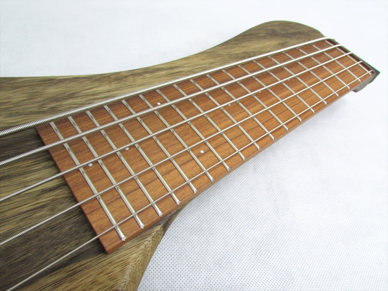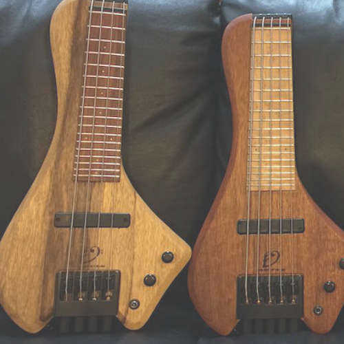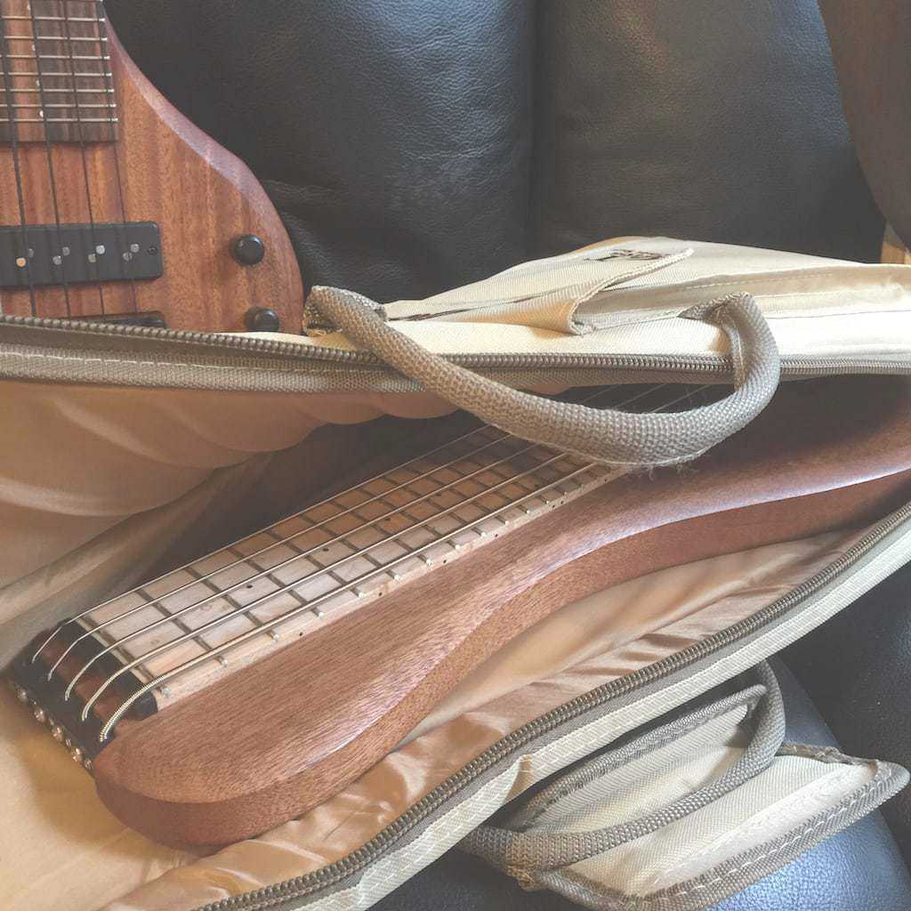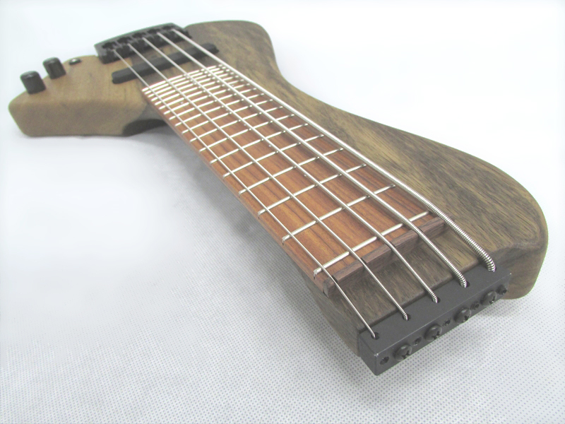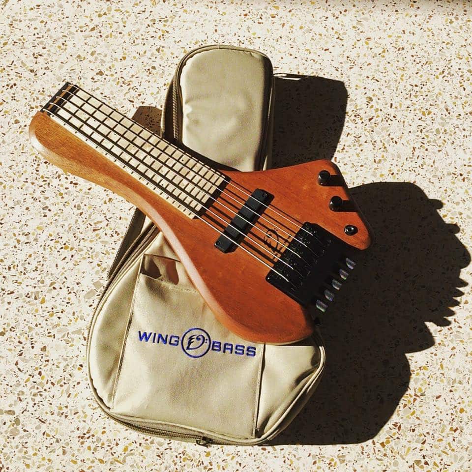 Wingbassの発想は、ツアーや旅行中にどんな場所でも練習したい、プレイし続けたいという欲求から生まれました。その際、11フレットより低い部分はなくても行けるのではないかと考えてみました。できあがったWingBassはノーマルベースでは考えられないこのとても小さなサイズと、チューニングがオクターブ上であるということくらいです。Wingbassは通常のベースと同様の弦、弦の太さを使えるように設計しており、弦間についても通常のベースとほぼ同じく作られているため、貴方のメインベースと演奏感の互換性が感じられるでしょう。