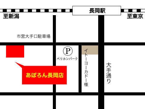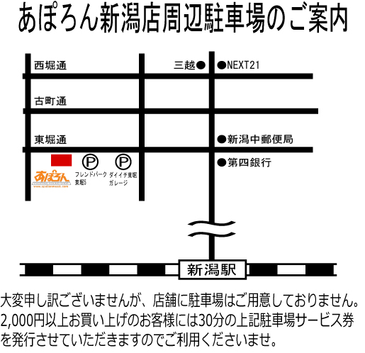 長岡店:店舗前に3台分駐車場あります。商品お買い上げのお客様にはご購入金額に関係なく30分無料駐車券を差し上げます。駐車券は長岡市共通駐車券指定駐車場にてお使いいただけます。