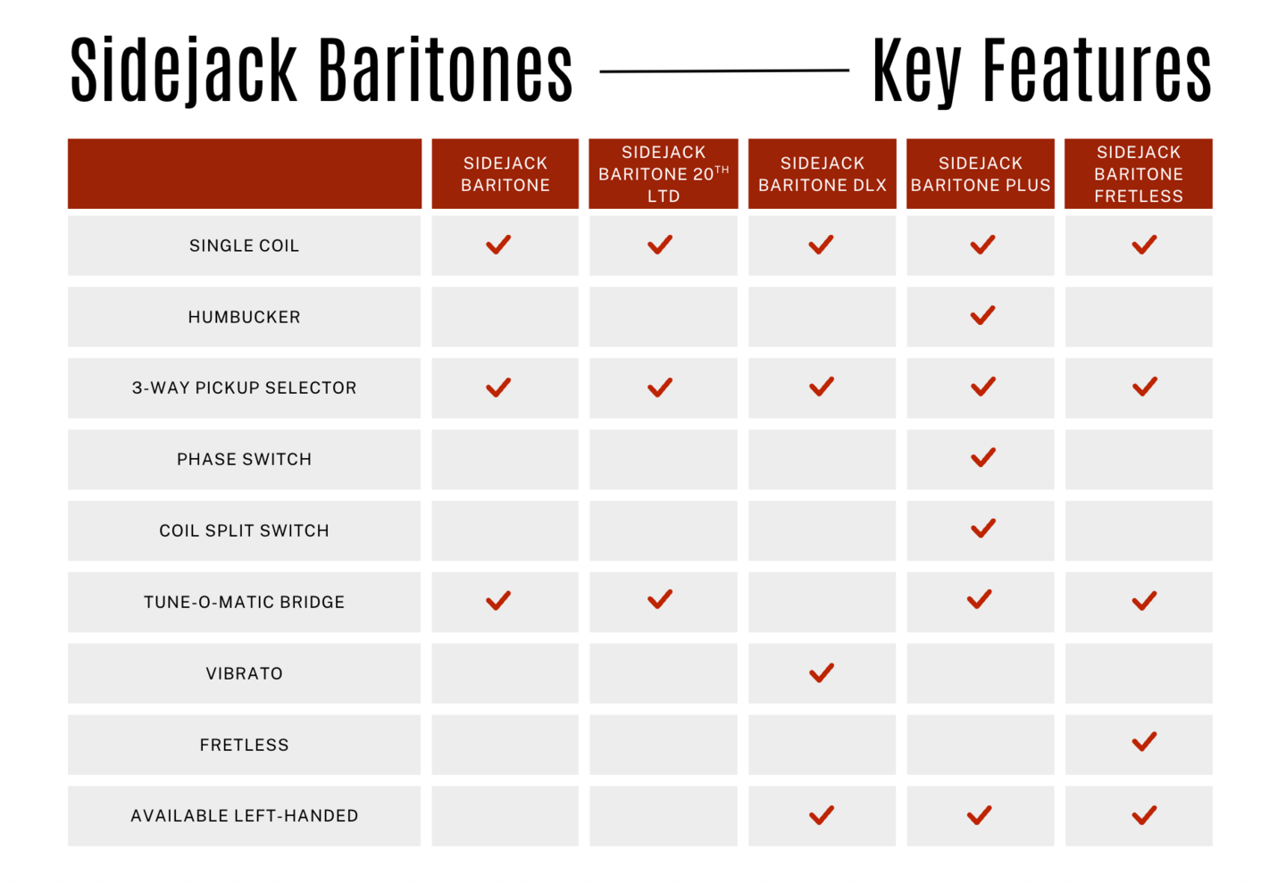 バリトンギターは、通常のギターと同じくらい弾きやすくなければなりません。そのため、人気の高い演奏性に優れたSidejackシリーズは、この拡張された音域のデザインに最適です。Sidejackシリーズは、ヴィンテージのMosriteギターにインスパイアされ、現代的なネックプロファイルと、弾きにくいとされるオリジナルよりも太いフレットワイヤーを採用することで改良されています。バリトンSidejackには5種類のモデルがあり、それぞれが少しずつ異なり、独自の魅力を備えています。このブログでは、各バリトンSidejackギターの特徴を詳しく説明し、あなたにぴったりの1本を見つけられるようお手伝いします。