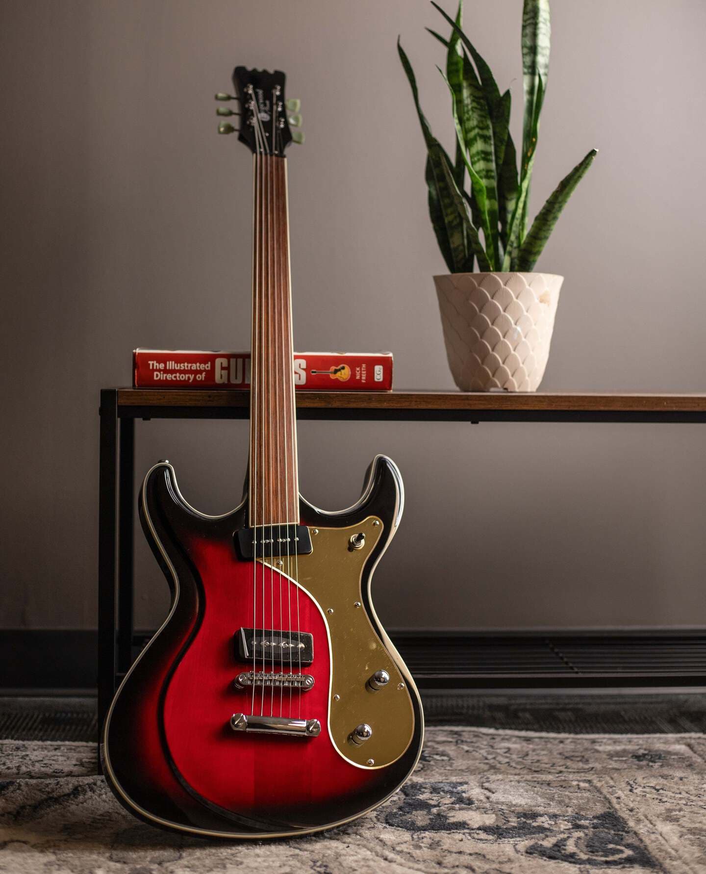 このモデルは、サイドジャック・バリトンの魅力であるレトロな美学と力強いP90ピックアップを継承しながら、フレットレスならではの微分音やグリッサンド表現を自在に操ります。ゴールドミラーピックガードが美しく映えるレッドバースト仕上げで、左利き用もご用意しています。