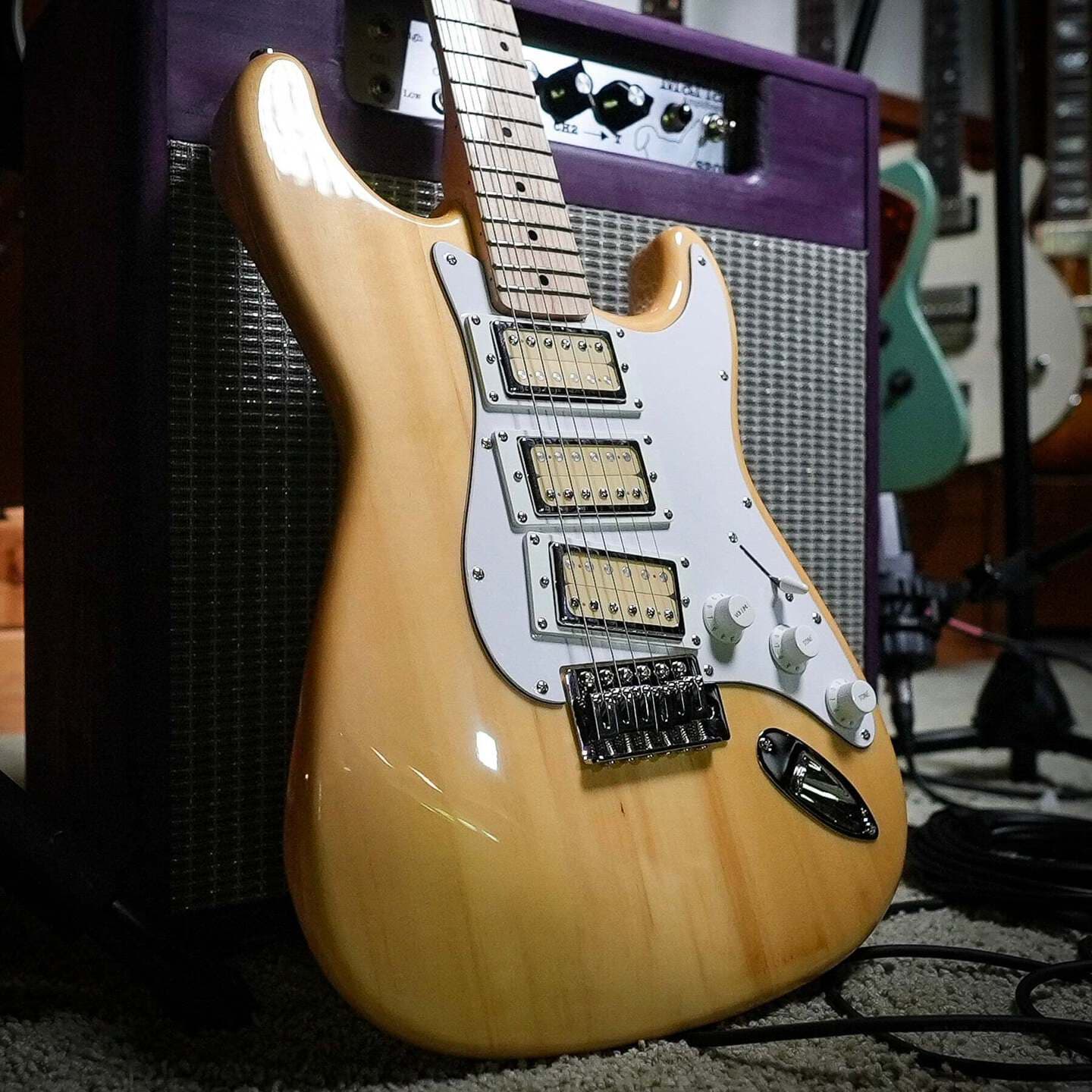 一見するとストラトキャスターのように見えますが、よく見るとシングルコイルではなく3基のホットなハムバッカーを搭載しているのがわかります。