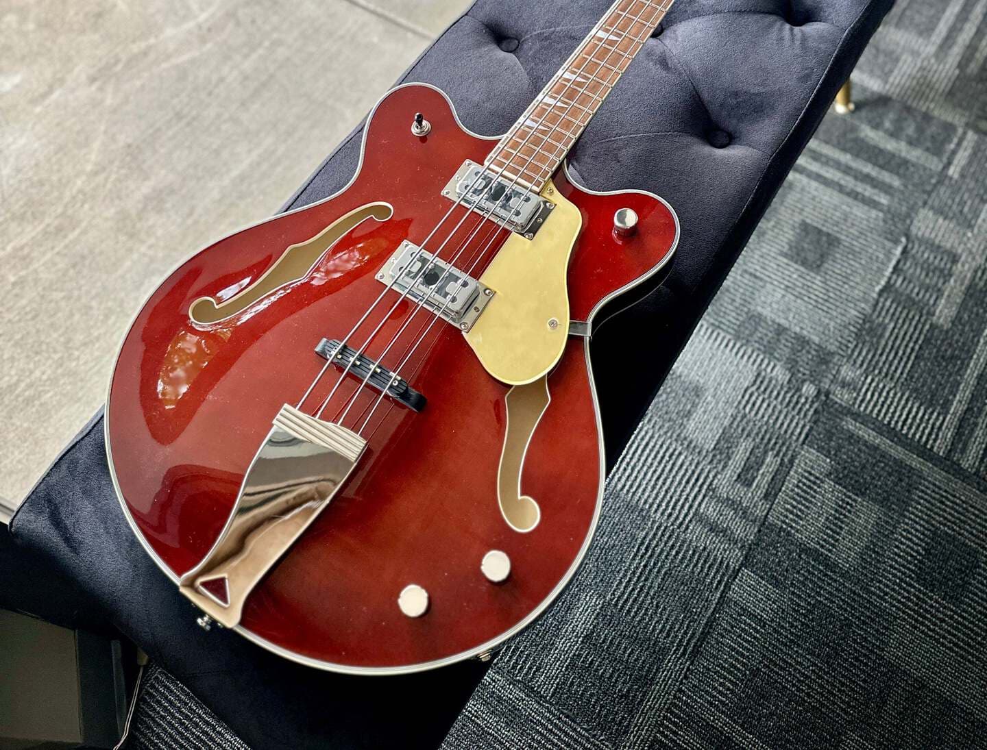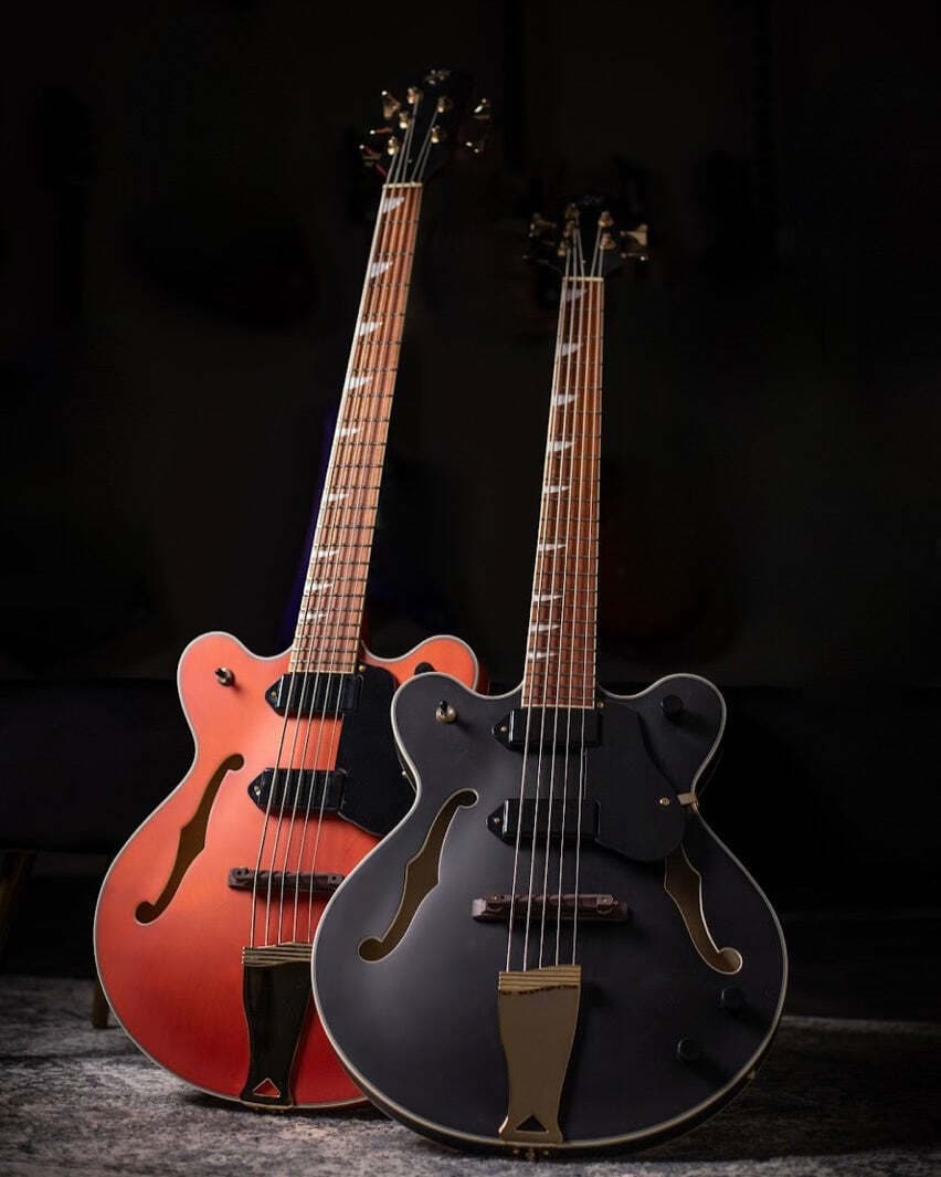 私たちは「拡張レンジ」楽器をあまり扱っていませんが、伝説のベーシスト、セエ・アデレカンには例外を設けます。彼はゴリラズのベーシストとして最もよく知られており、5弦ベースが必要だと相談に来たとき、私たちは彼のためにシグネチャーモデルのカスタム・イーストウッド・モデルを作る絶好の機会だと考えました。その結果生まれたのが、スタイリッシュなマット仕上げとゴールドのハードウェアを備えた、フルホロウの5弦ベースです。カスタム・レール・ピックアップを搭載しており、間違いなく素晴らしいトーンを奏でます