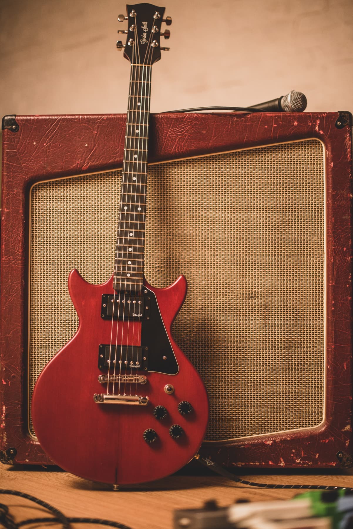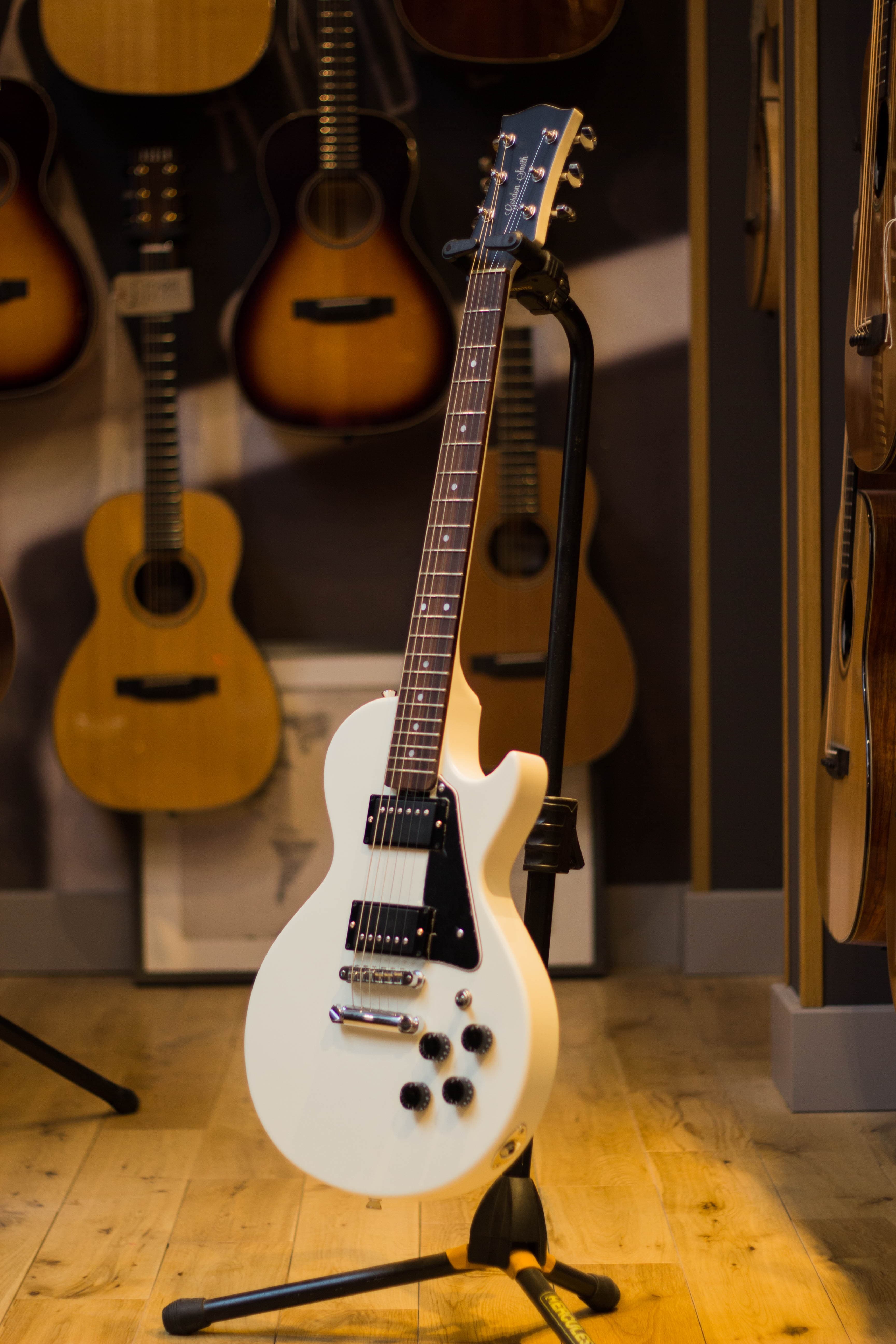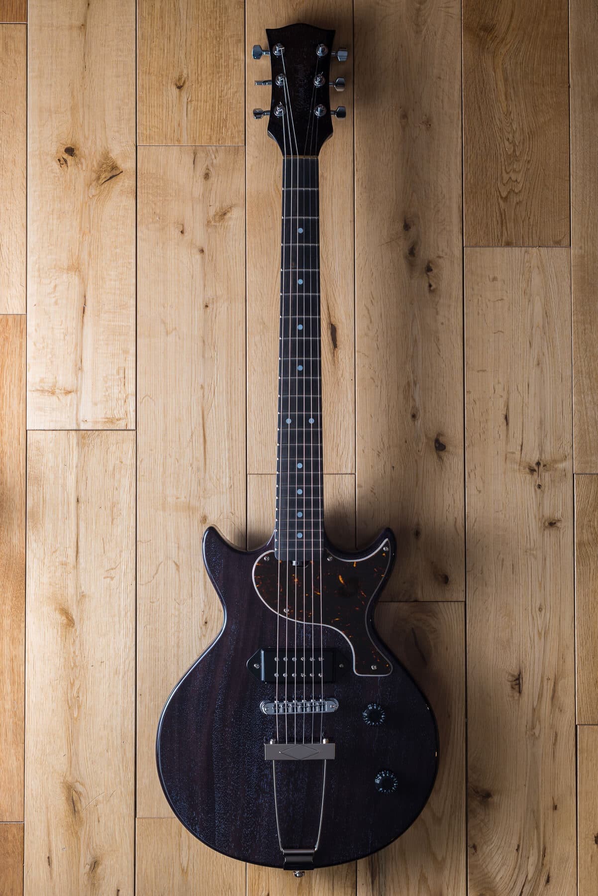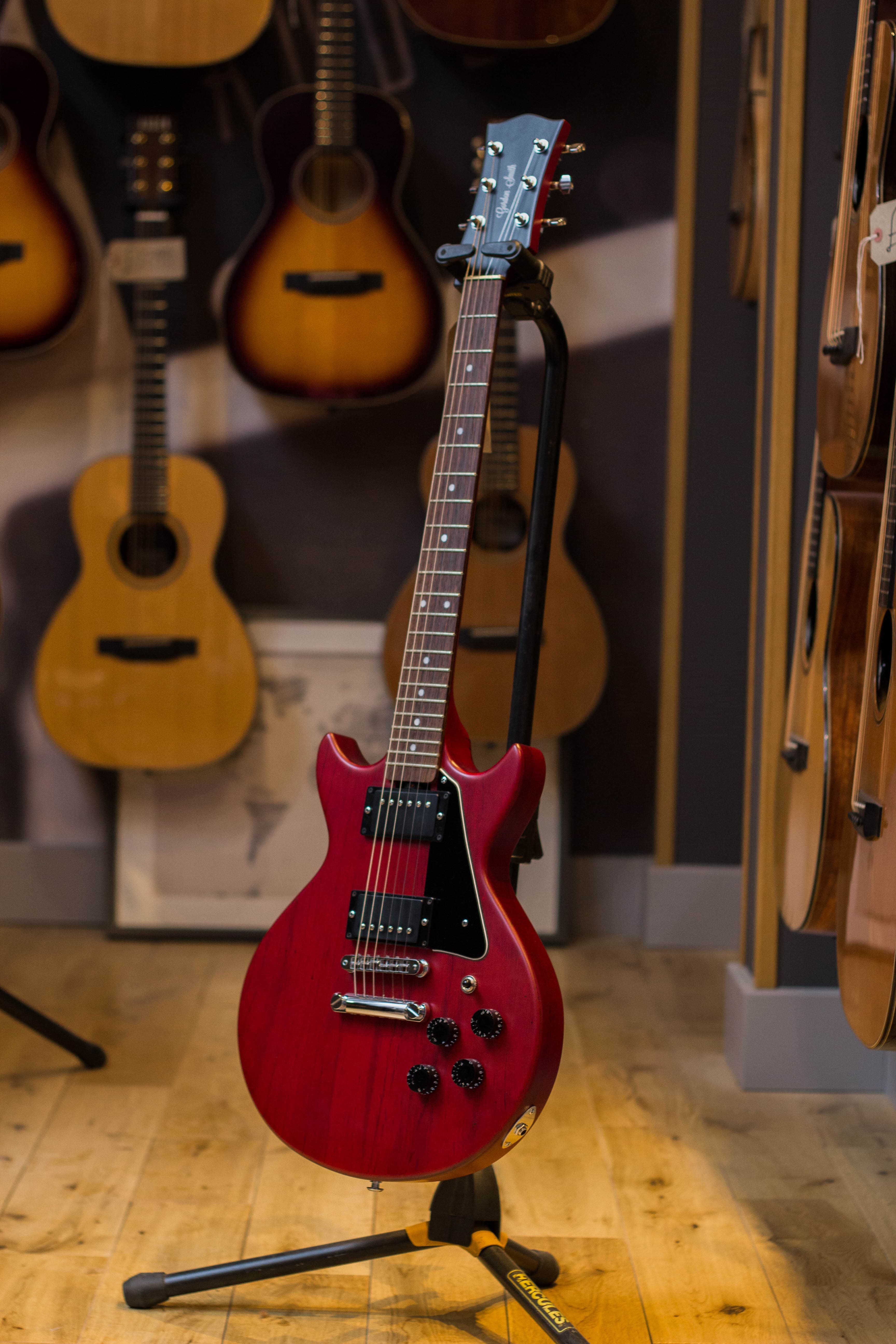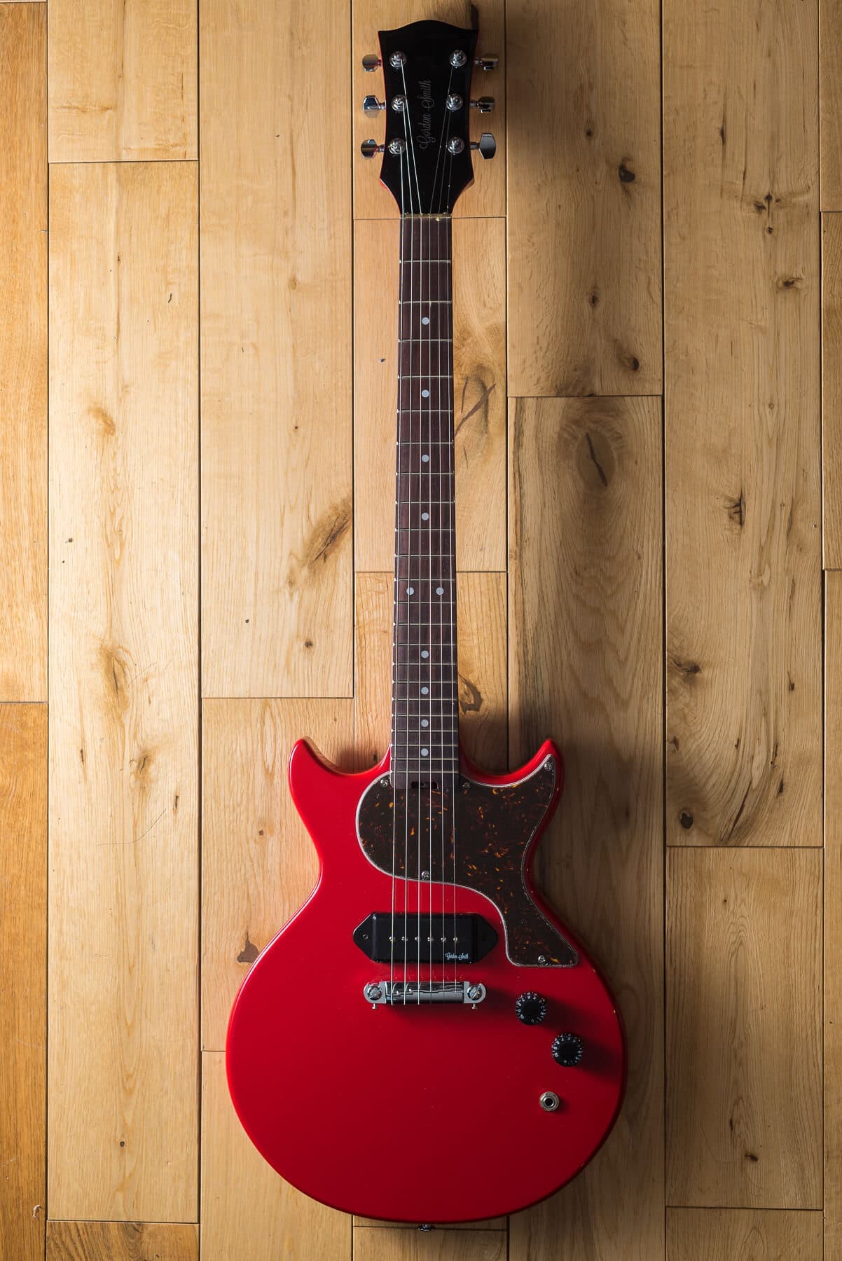 Gordon Smithのメインモデルである、ダブルカッタウェイ・ボディのLP-JrスタイルのGS1のフロントにシングルコイルを追加したSHピックアップ・レイアウトモデルが GS-1.5です。