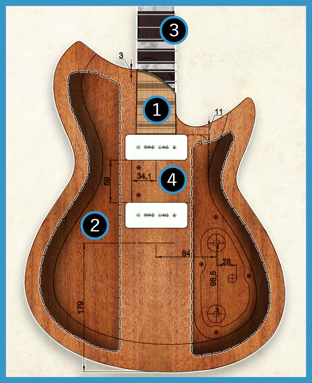 暖かい音響共振を付加し、ギターの重量を軽くするために、マホガニー・ボディの両サイドに、チェンバー(セミホロウボディ)加工を施しています。