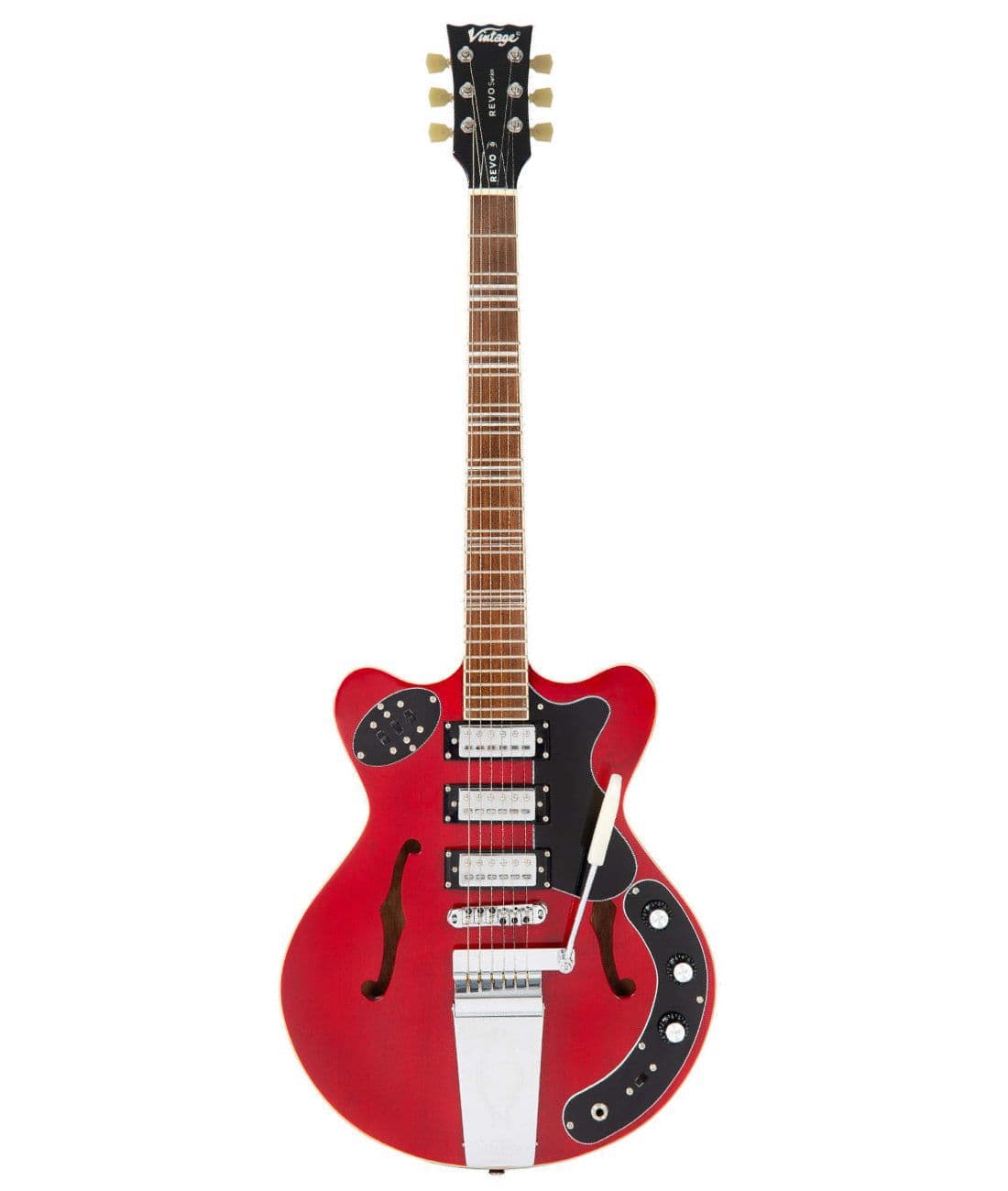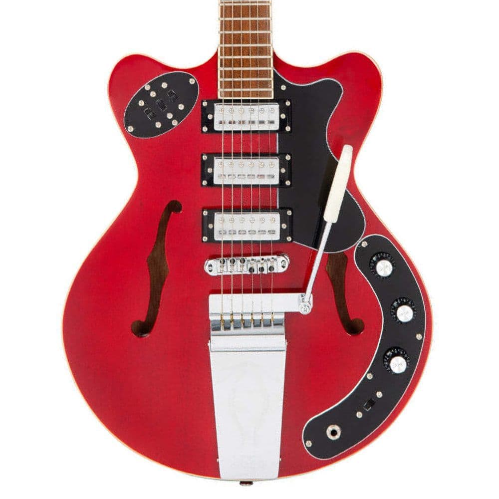 ダブルバウンド・ボディ、マホガニー・セットネック、22フレット・バウンド・ジャトバ指板、特徴的なパターン・インレイ、レトロなビブラート・デザインなど、60年代のビッグボディ・セミアコースティック・エレクトリック・ギターのファンにはたまらないモデルです。